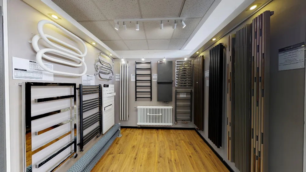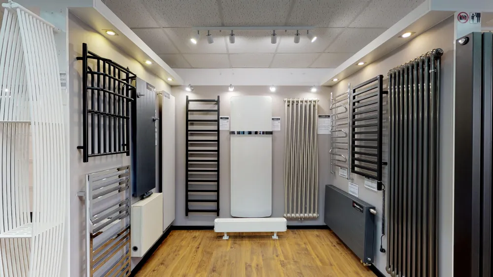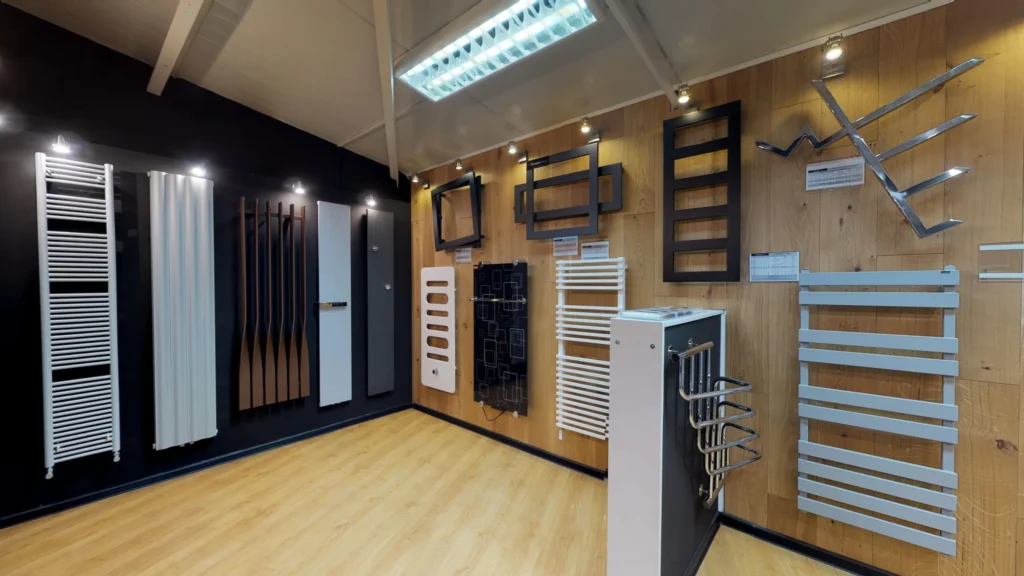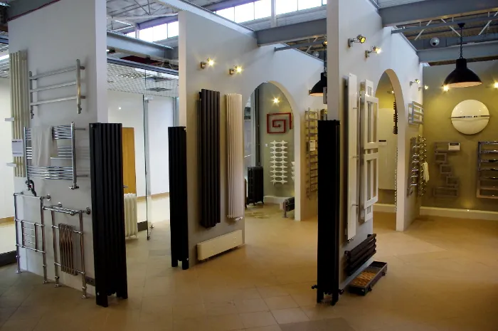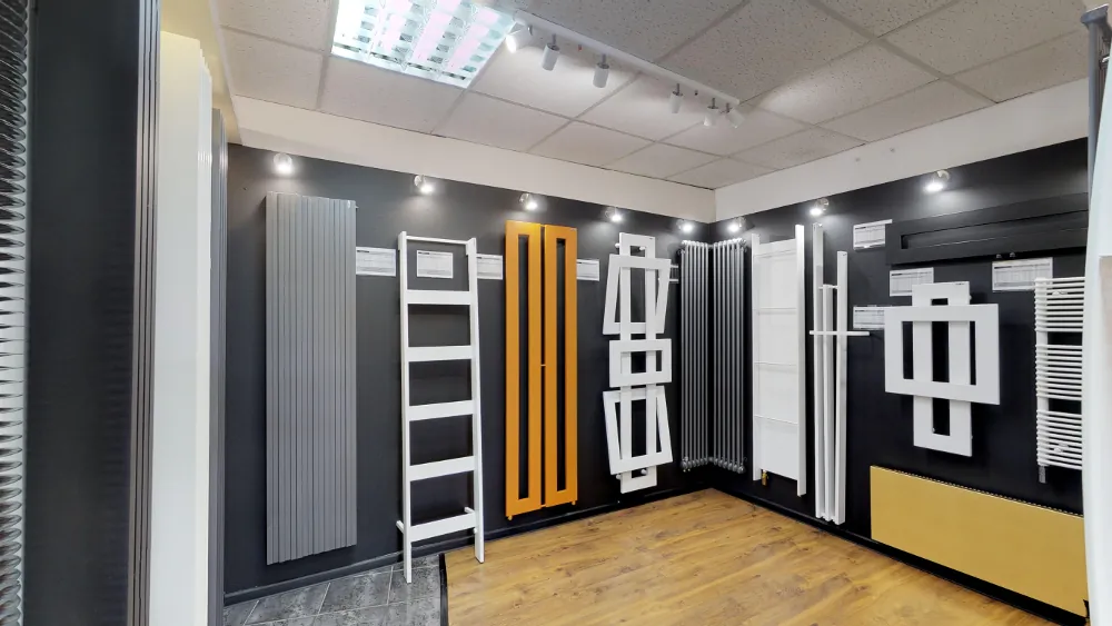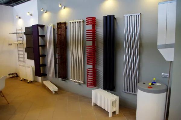Setki grzejników na ekspozycji w różnych rozmiarach i wykończeniach