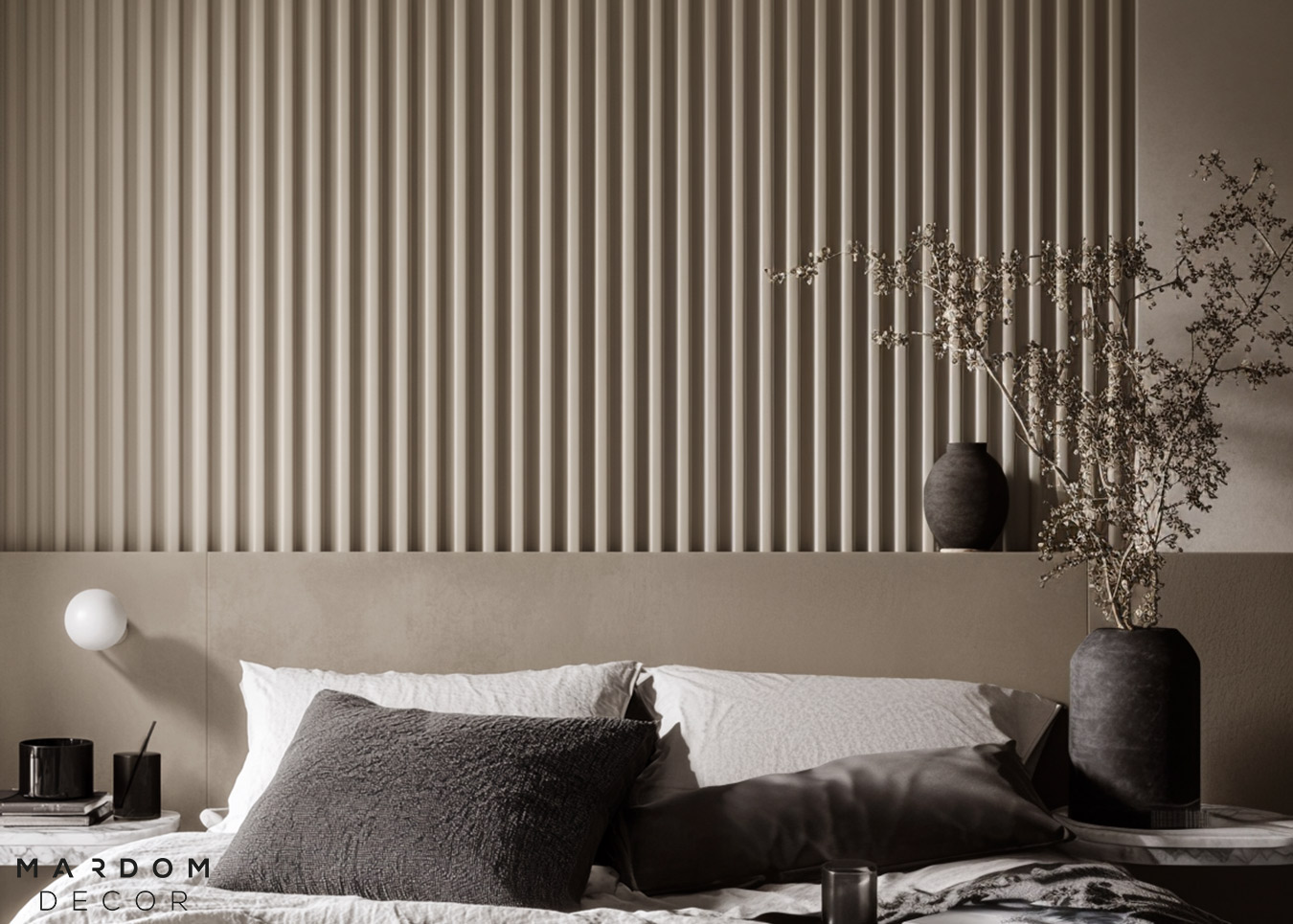 - Pionowe podziały – podkreślają rytm łóżka, stolików nocnych i kinkietów